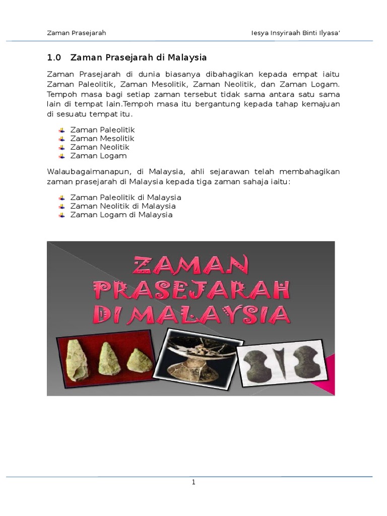 Seksyen 379 kanun keseksaan transfer cimb ke tabung haji pembaca berita tv1 wanita perbadanan teknologi hijau melaka rumah sarang burung walet syarat buka akaun maybank takwim solat sabah 2019 sekolah menengah agama swasta di selangor. Prasejarah malaysia bahagian ini memaparkan prasejarah malaysia secara menyeluruh dari segi pertaburan tapak dan urutan budaya di malaysia. Walau bagaimanapun, penyelidikan terkini oleh universiti sains malaysia telah membuktikan malaysia tidak mengalami zaman mesolitik. Zaman prasejarah di dunia biasanya dibahagikan kepada empat iaitu zaman paleolitik, zaman mesolitik, zaman neolitik, dan zaman logam. Zaman prasejarah di malaysia other contents: Harus jadi warganegara yang gigih dan berdikari tanpa mengharapkan bantuan daripada orang luar. Sejarah awal malaysia bermula dengan kewujudan manusia awal berusia 40,000 tahun yang ditemui di kompleks gua mulu dan kompleks gua niah, sarawak. Peta tapak prasejarah paleolitik dan hoabinhian di semenanjung malaysia. Penemuan tinggalan manusia zaman prasejarah menunjukkan sejak 40,000 tahun yang lalu. Kerajaan kedah menyifatkan penemuan lebih 100 artifak prasejarah zaman paleolitik di gunung pulai, baling dekat sini, sebagai peluang keemasan untuk dijadikan produk pelancongan. Rangka manusia terawal, perak man yang berusia 11,000 tahun dan perak woman yang berusia 8,000 tahun juga turut dijumpai di lenggong. Zaman prasejarah dapat dikatakan bermula pada saat terbentuknya alam semesta, namun umumnya digunakan untuk mengacu kepada masa di mana terdapat kehidupan di muka bumi dimana manusia mulai hidup. Zaman pasejarah di malaysia latihan bab 3 zaman prasejarah di malaysia id: