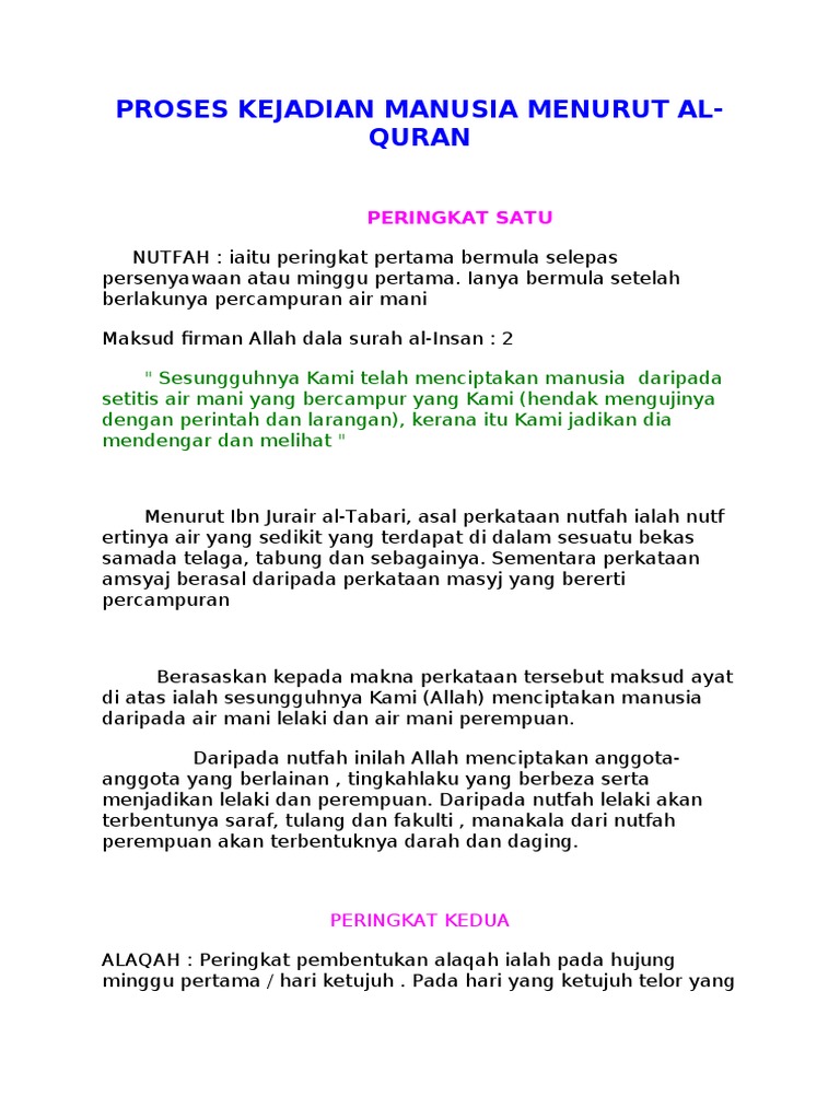 Maka dalam huraian seterusnya penulis akan menghuraikan proses kejadian manusia ini melalui beberapa peringkat dengan merujuk kepada. Daripada abu abdul rahman, abdullah bin mas'ud r.a katanya: Maka maha sucilah allah, pencipta yang. Kebanyakan ahli tafsir menafsirkan alaqah. Sesungguhnya aku hendak menjadikan seorang khalifah di muka bumi.