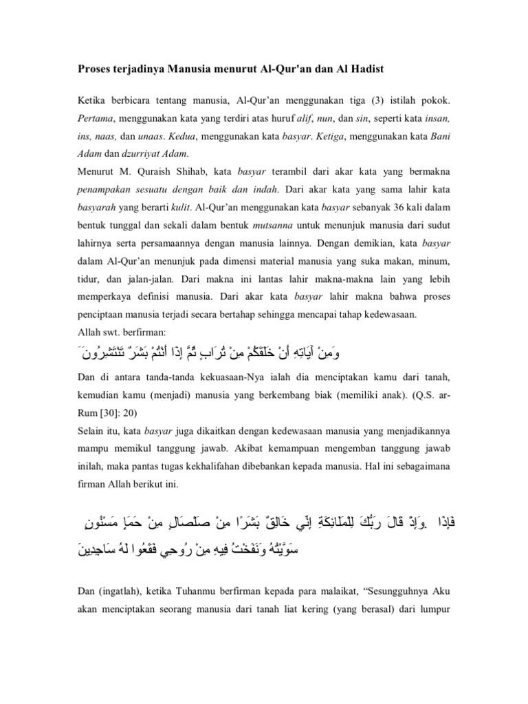 Dan sesungguhnya kami telah menciptakan manusia dari suatu saripati (berasal) dari tanah. Dan apakah mereka tidak memperhatikan bagaimana allah menciptakannya(manusia)dari permulaannya,dan kemudian mengulanginya(kembali).sesungguhnya ,yang. Manusia disebut dengan lafaz insane (mufrad) atau nas (jama). Kemudian air mani itu kami jadikan segumpal darah. ('blastocyst' yang hidup atau yang keguguran berbentuk seperti darah beku).